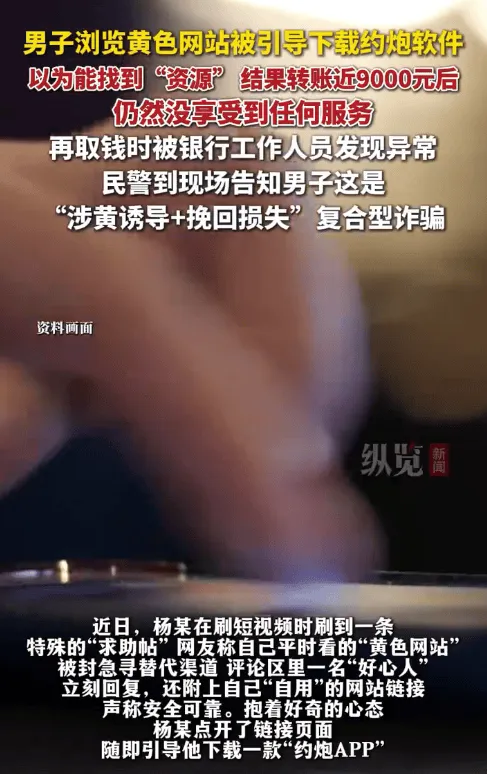 虎扑11月06日讯 近日,杨某在刷短视频时刷到一条特殊的“求助帖”,网友称自己平时看的“黄色网站”被封急寻替代渠道,评论区里一名“好心人”立刻回复,还附上自己“自用”的网站链接,声称安全可靠。抱着好奇的心态,杨某点开了链接页面,随即引导他下载一款“约炮APP”。杨某本以为能找到“资源”,可下载后发现需要充值才能解锁功能,杨某二话不说就找到客服要求充值。转账近9000元后,杨某仍然没享受到任何服务。就在杨某着急上火时,客服称“只要再交最后一笔钱,就能解冻账户并返还之前的转账”。但这次要求不一样,对方要求杨某取出现金,送到指定的偏僻烂尾楼。可现金送出后,客服不仅没兑现承诺,反而再次提出更高的“解冻费”。