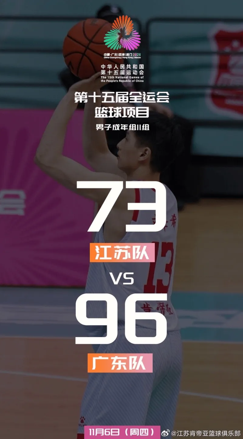 虎扑11月06日讯 今日全运会小组赛,江苏队73-96不敌广东。