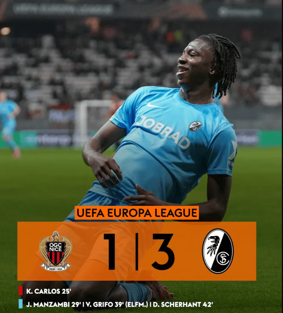 虎扑11月07日讯 在刚刚结束的一场欧联联赛阶段的比赛中,弗赖堡在客场先丢球的情况下连入3球,3-1逆转尼斯。