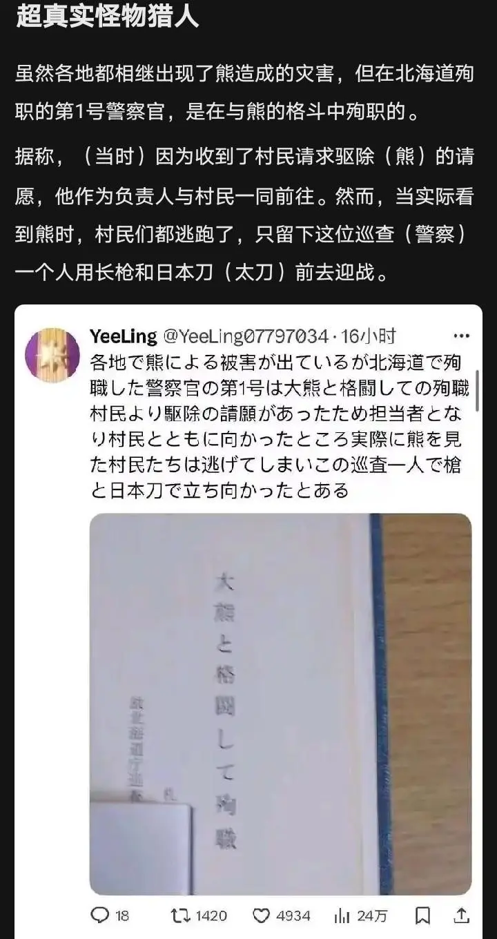 嗯,我有个故事,在虎扑说过几回了,骗了不少亮。我的一位种子供应商,老外。几个人去罗马尼亚打熊,遭遇一只大黑熊,他一枪过去,熊直接倒地。他也是第一次打熊,一发入魂,太兴奋了,直接冲上去查看。万万没想到,熊装死,等他走近站起来就给他一巴掌,把他打飞了出去。熊打飞了他,嗷嗷叫着逃了。同伴喊了直升飞机,把他救出去才留了一条命。我第一次看见他的时候吓了一跳,那脑袋和乒乓球踩扁的一样,半边塌陷下去,右边脸的眼珠和牙齿都没了,整张脸和鬼一样,十分恐怖。据说那还是一只刚成年的熊,算新秀,再大点的熊这么一下就救不回来了。