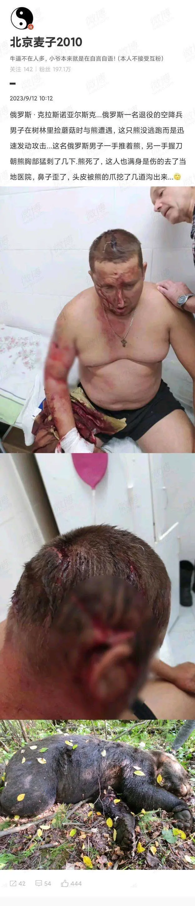 不好说。他以前部队的,匕首属于他惯用武器。。。看他的伤应该是熊已经抱上把他压在下面后脑伤,他正面腹部是没伤的。他应该是被压在下面对熊腹部连续穿刺了。我猜可能就这个赢法。。。