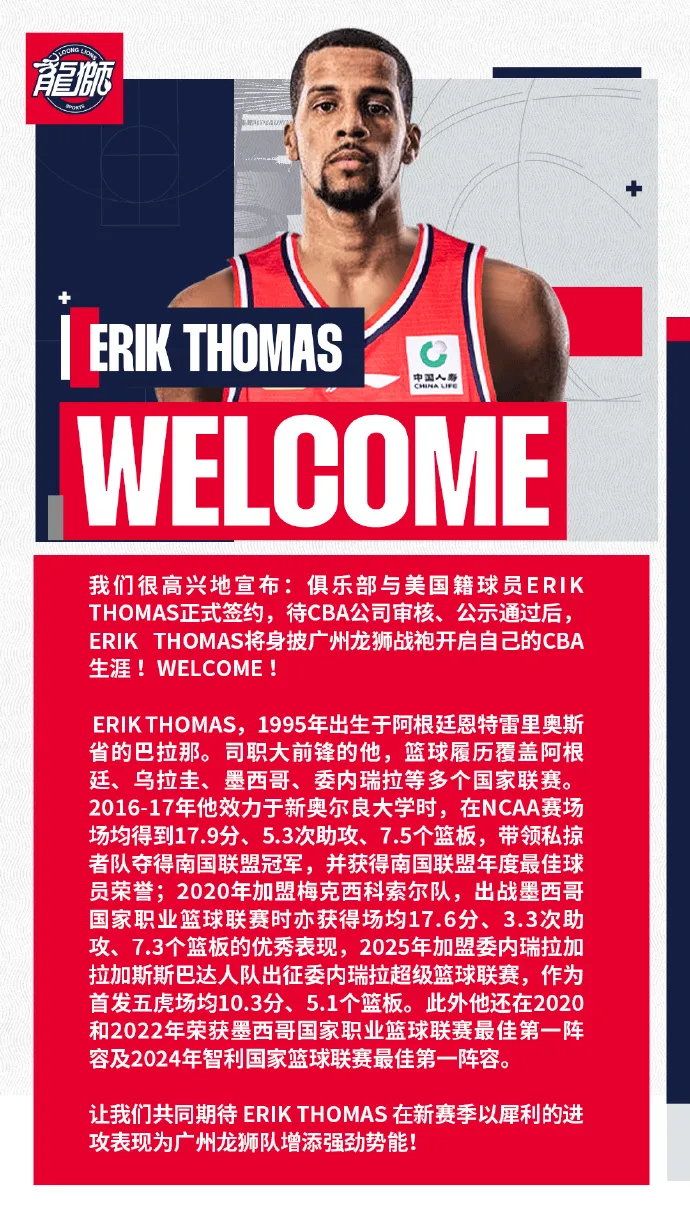 原文如下:“我们很高兴地宣布:俱乐部与美国籍球员Erik Thomas正式签约,待CBA公司审核、公示通过后,Erik Thomas将身披广州龙狮战袍开启自己的CBA生涯!Welcome!