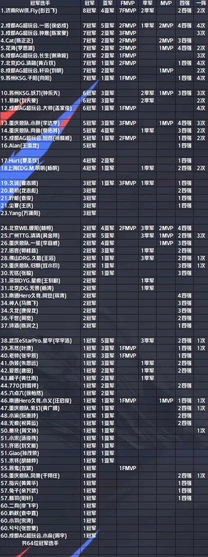 历史地位不看是不是老大冠军的吗,fly职业生涯就一次19年冬冠是队伍核心,早期核心是cat和hurt,后期是小胖,拿了一堆伊戈达拉式的fmvp