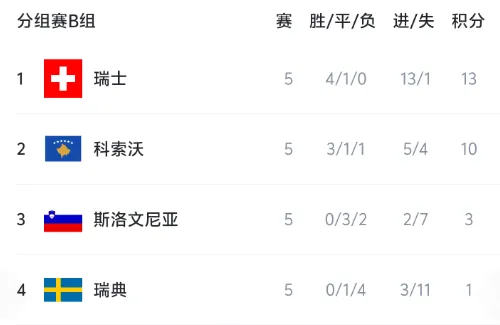 垫底的瑞典已经通过欧国联途径锁定了一个附加赛的参赛席位,排名第三的斯洛文尼亚则已经彻底无缘美加墨世界杯。