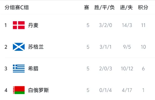 本轮排名小组前两名的丹麦和苏格兰都没能赢球,不过手握积分优势的丹麦还是占据主动权的一方——他们在末轮客战苏格兰的比赛中只要不输球就能够以小组头名的身份直通美加墨世界杯。