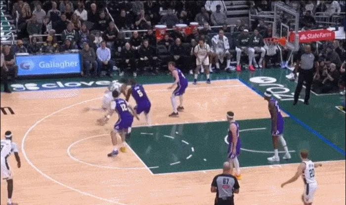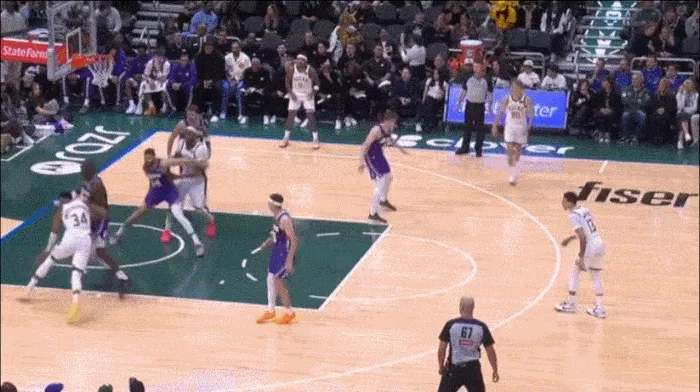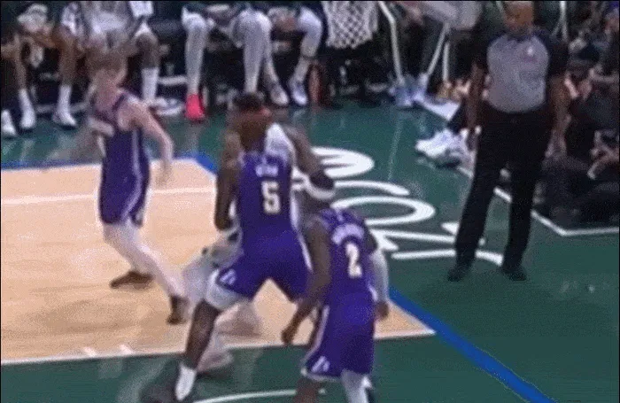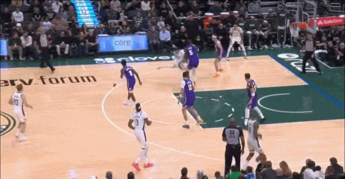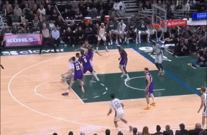 开场字母哥就从三分线突破 一路撞开艾顿 虽然犯规了 但是是最后准备封盖的时候打手 并不是对抗不上或者脚步跟不上
