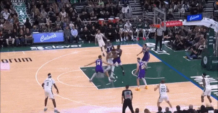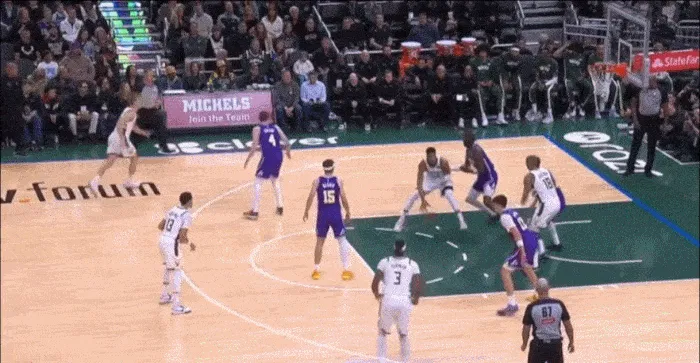 背身单打 想撞开艾顿 但是艾顿吃住了对抗 并没有轻易让字母哥打进内线 并在最后伸手干扰时也注意直臂