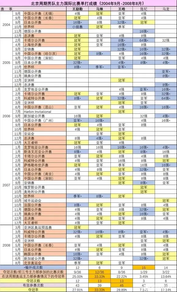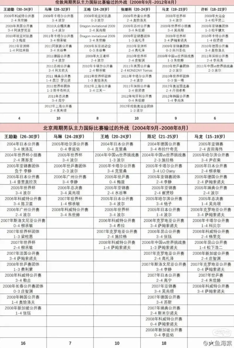 附北京周期各主力成绩和输外战次数,05年除了王励勤拿了很多冠军,王皓1冠,马琳、陈玘、马龙都是0冠。06年马龙确实打的一般。至于被打压的郝帅,他07年和马龙同年首拿公开赛冠军,此时多少岁了自己算。至于输外战次数,如果马龙属于被特殊照顾,那么国家队在北京周期可以就地解散了。