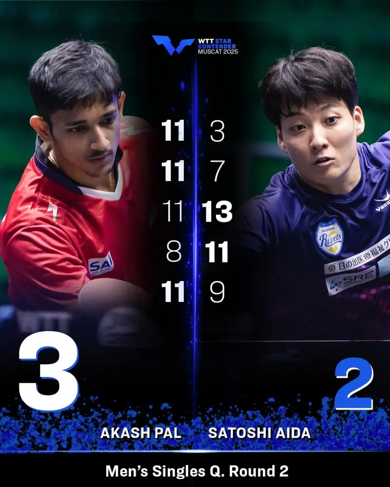 WTTins报道,9号资格赛种子选手阿克什·帕尔在与相田聪的激烈对决中以3-2险胜,惊险晋级资格赛第三轮!💪💥