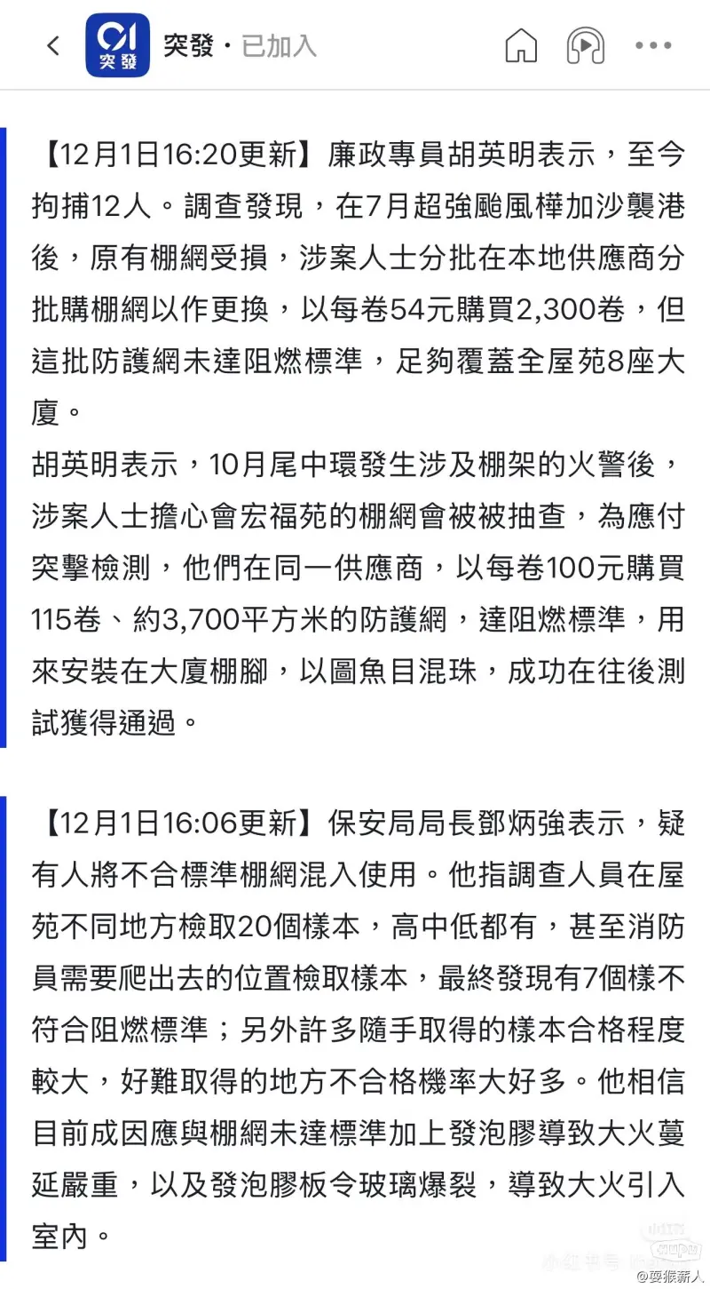 深入调查的原因肯定是多重因素造成的,翻新的成本问题,香港这类老旧建筑翻新一向能筹集的资金都很有限,包括现在的政府城市更新项目也是如此,中标一般更考虑报价最低的企业,更别说这是老楼业主自发筹资的修缮工程。那么成本在这里了,材料方面肯定会缩水,这就是棚网不达标准的问题。还有香港的建筑楼间距问题,也是原因之一。还有外立面堆放的易燃杂物,以及为了封窗每户用的发泡胶。还有高层建筑本身的救灾难度就大。竹子并不是热值很高的东西,也没那么容易点燃。大范围火灾,空隙中的氧气比可燃烧物质更危险。钢管导热快,可以预热火灾边缘的可燃物质,搭在钢架上的尼龙网和塑料,烧起来一样壮观。如果火灾成了规模,钢管的强度(遇火消失)和导热并不是救灾的有利条件。正确归因,而不是简单归因。希望大家都有独立思考的能力。