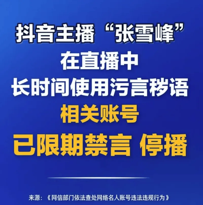 虎扑12月03日讯 近期,网信部门依法处置多起网络名人账号违法违规行为。抖音主播“张雪峰”因在直播中长时间使用污言秽语,其账号已被限期禁言、停播。