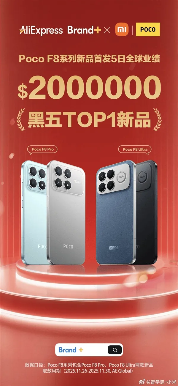 虎扑12月04日讯 据小米集团高级副总裁、国际部总裁曾学忠介绍,POCO F8系列在AE(global)首销卖爆,成为平台黑五GMV TOP1新品,首发5天全球业绩绩200万美元(约合人民币1413万)。