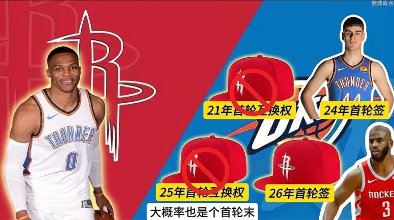 当年火箭为了哈登,把保罗送走到雷霆,换来了三弟威少,还给了雷霆2个首轮(24+26),以及2个首轮互换(21+25)