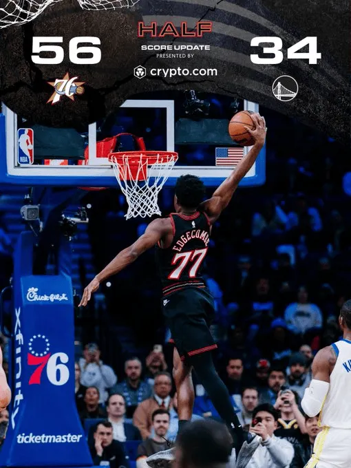 虎扑12月05日讯 今天NBA常规赛76人主场迎战勇士的比赛正在进行中。目前双方半场战罢,76人以56-34领先勇士。
