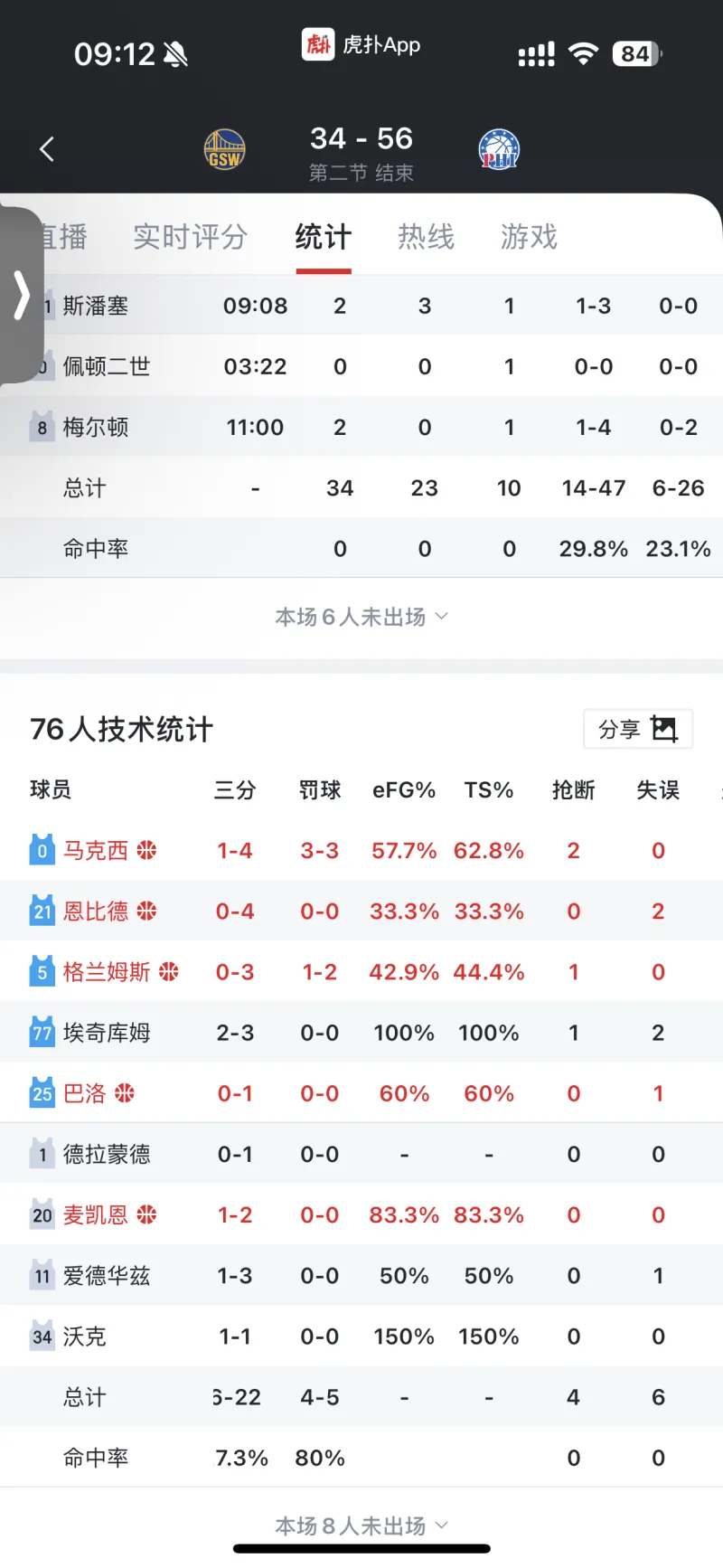 半场比赛,76人没有出现一次失误,而勇士则送出7次失误&落后22分,篮板数也落后76人7个。