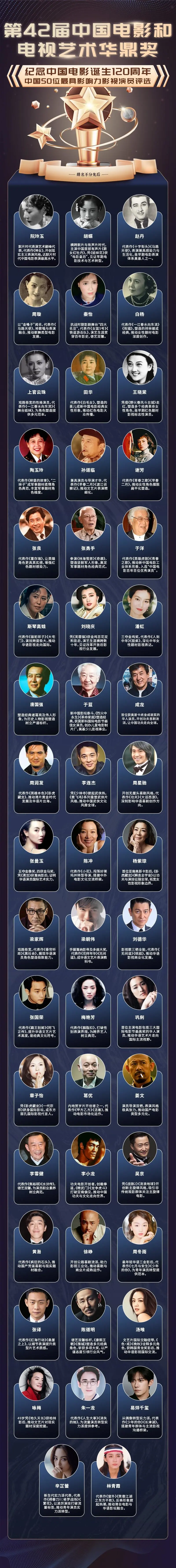 组委会表示,在中国电影120年的波澜壮阔发展历程中,演员始终是故事的讲述者、文化的传播者、精神的传承者。此次榜单的发布,不仅是对过往百年艺术成就的回望与致敬,更希望以先辈艺术家为榜样,激励当代影视从业者坚守文化根脉、深耕艺术创作,在技术革新与产业变革的浪潮中始终保持人文初心,让中国电影在世界影坛持续传递东方美学与中国精神。