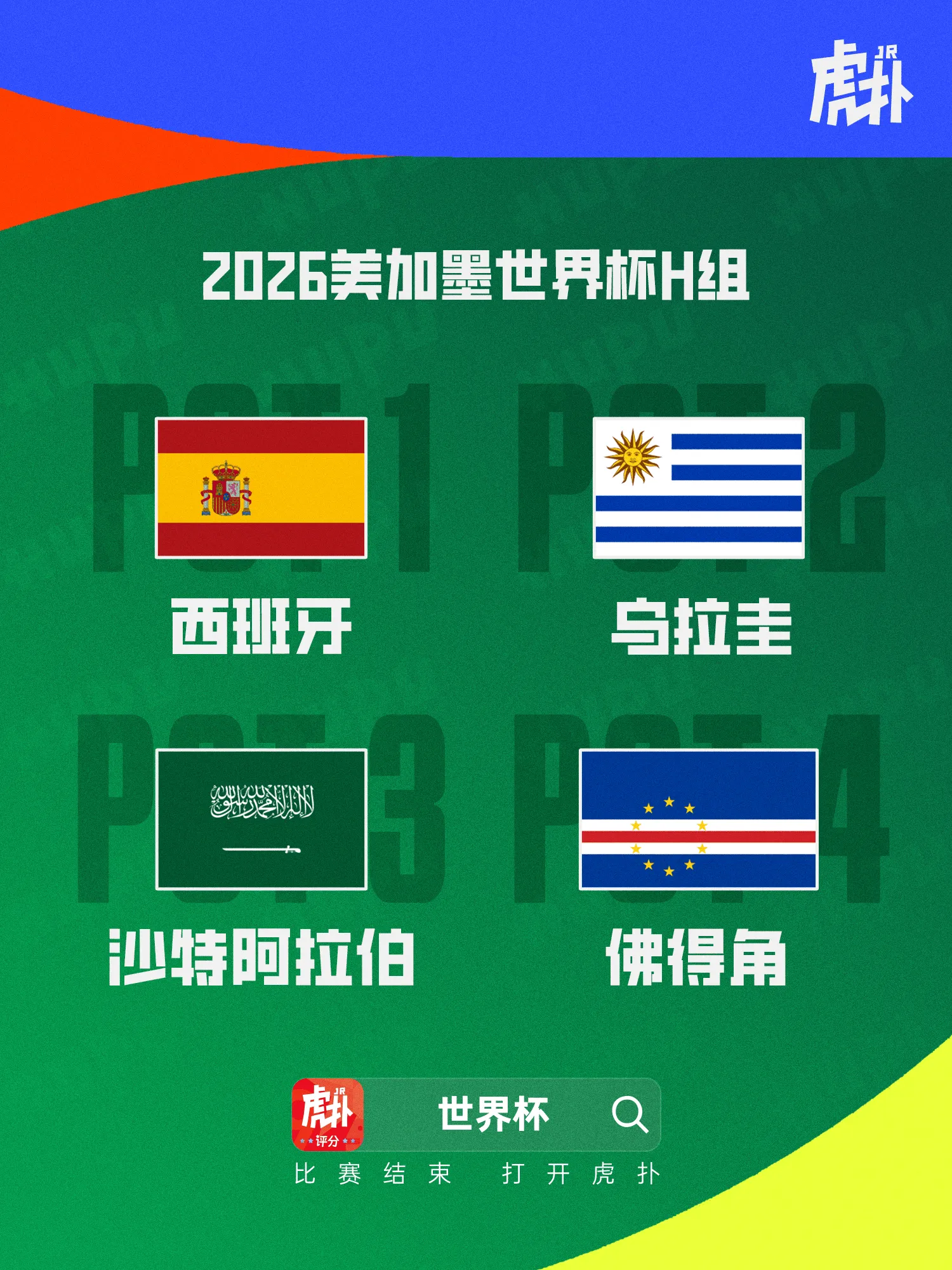虎扑12月06日讯 2026美加墨世界杯分组抽签仪式在华盛顿进行。H组的4支球队为西班牙、乌拉圭、沙特阿拉伯、佛得角。