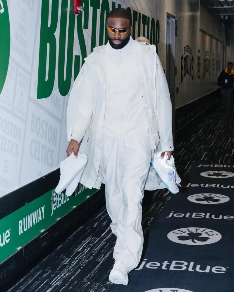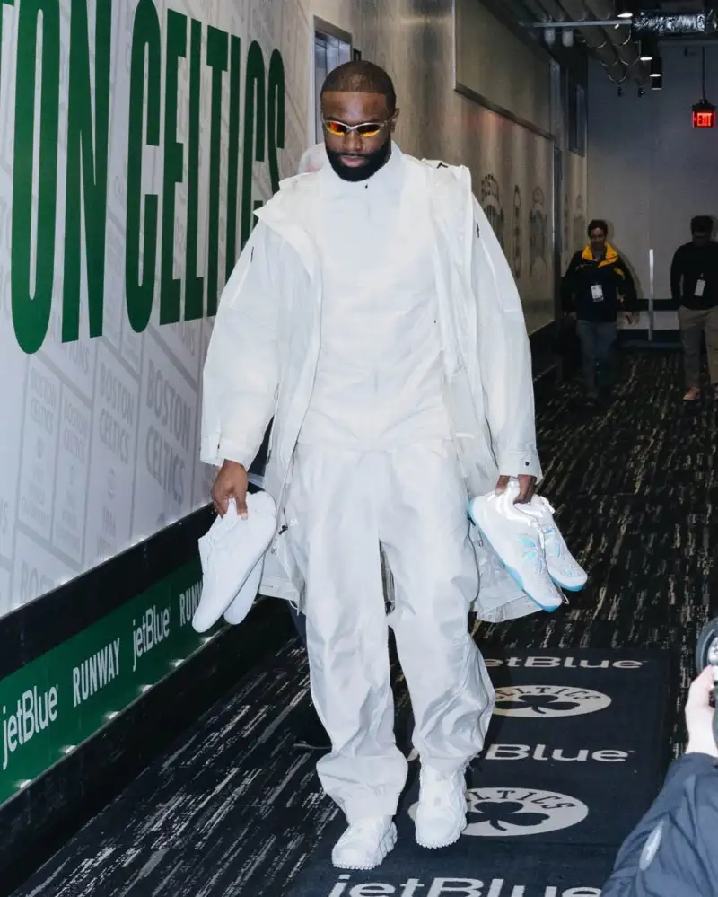赛前球员入场环节,杰伦-布朗携3D打印个人品牌球鞋741 Performance V1步入球馆。
