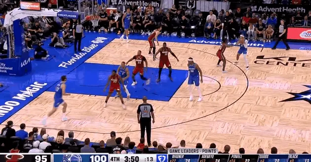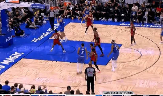 第四节比赛中,瓦格纳底线空切接球单臂重扣砍下30分,魔术剩3分钟领先5分。