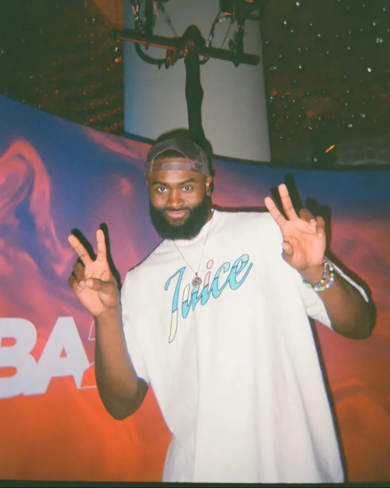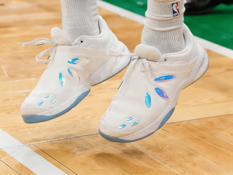 比赛中,布朗上脚白蓝色个人品牌球鞋741 Performance。