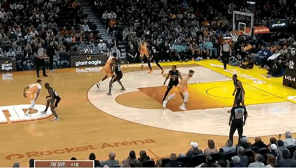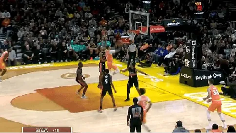 比赛的第三节,鲍尔突破滑翔换手上篮打进,骑士领先马刺20分。