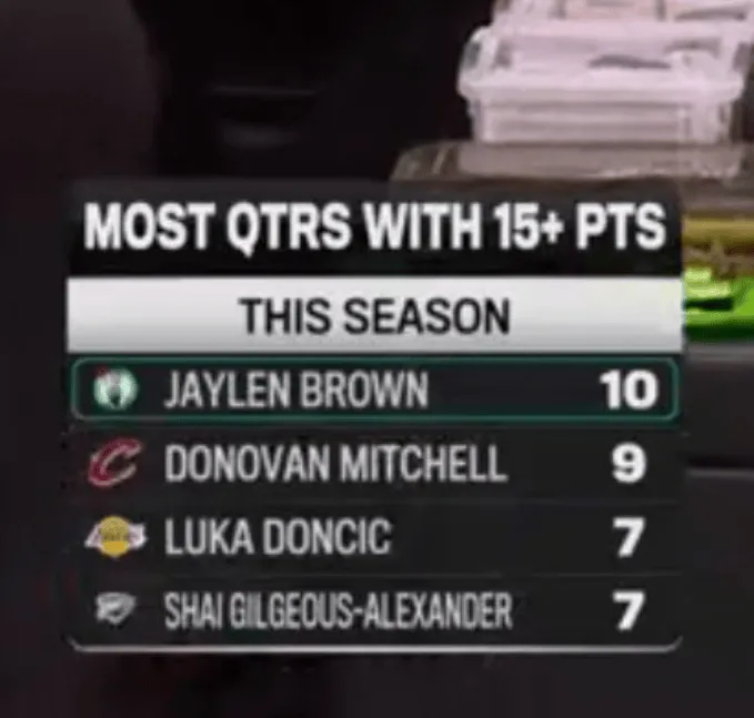 本场比赛,杰伦-布朗第三节独得15分,是本赛季第10次单节砍下15+,联盟最多,前4如下: