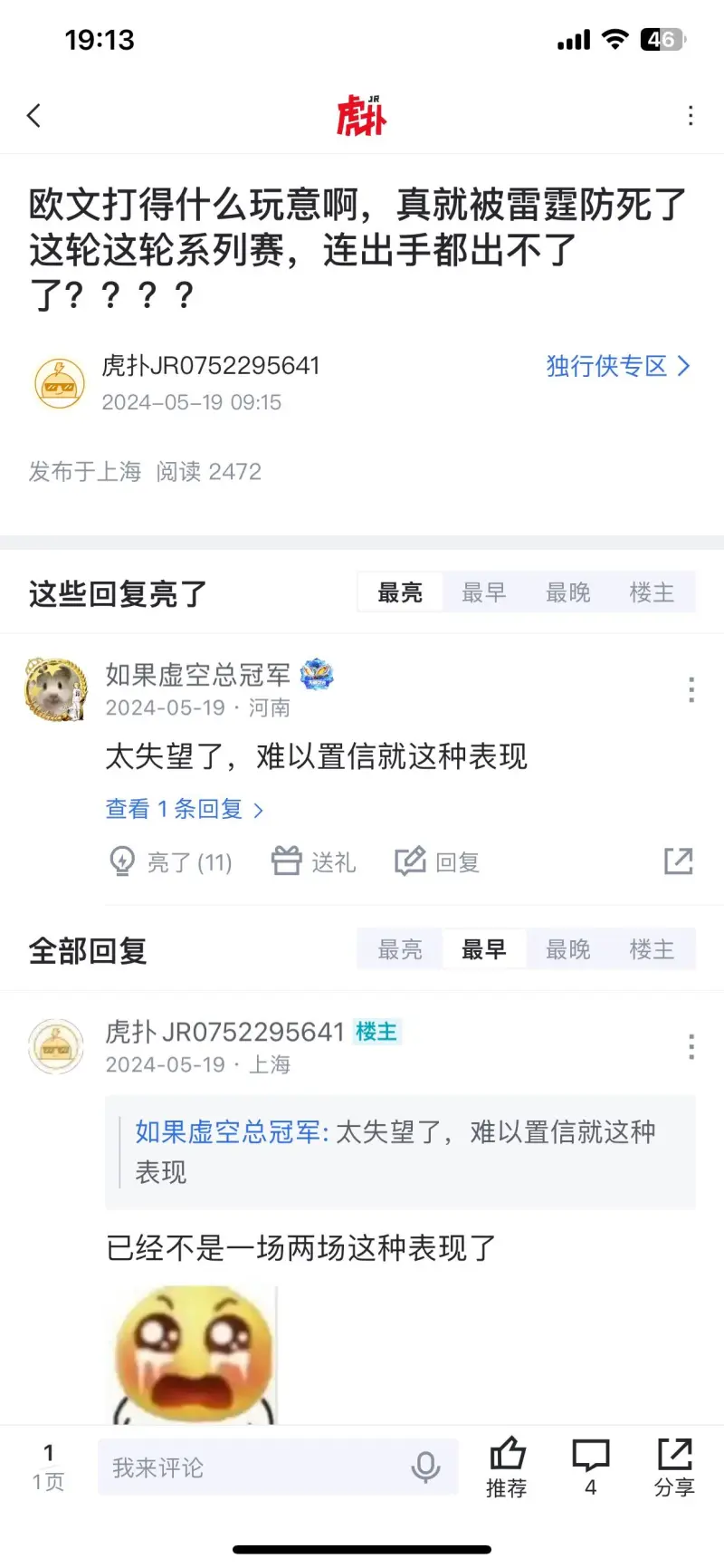 打的差就要喷。077上赛季杯赛半场2分一样全锅。