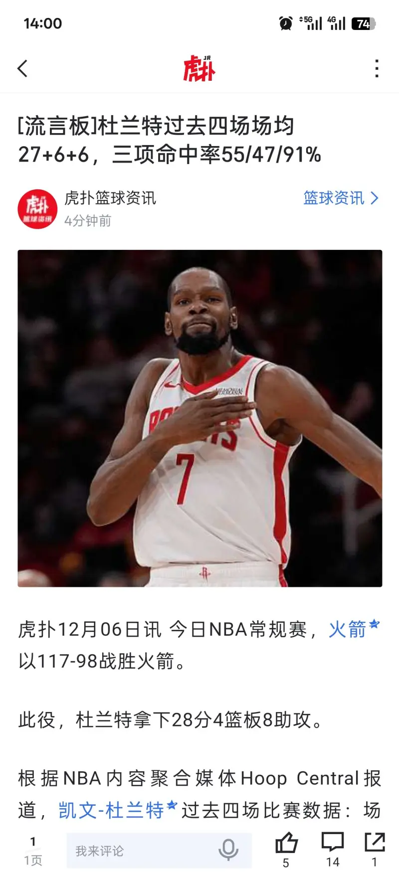 虎扑12月06日讯 今日NBA常规赛,火箭以117-98战胜太阳。
