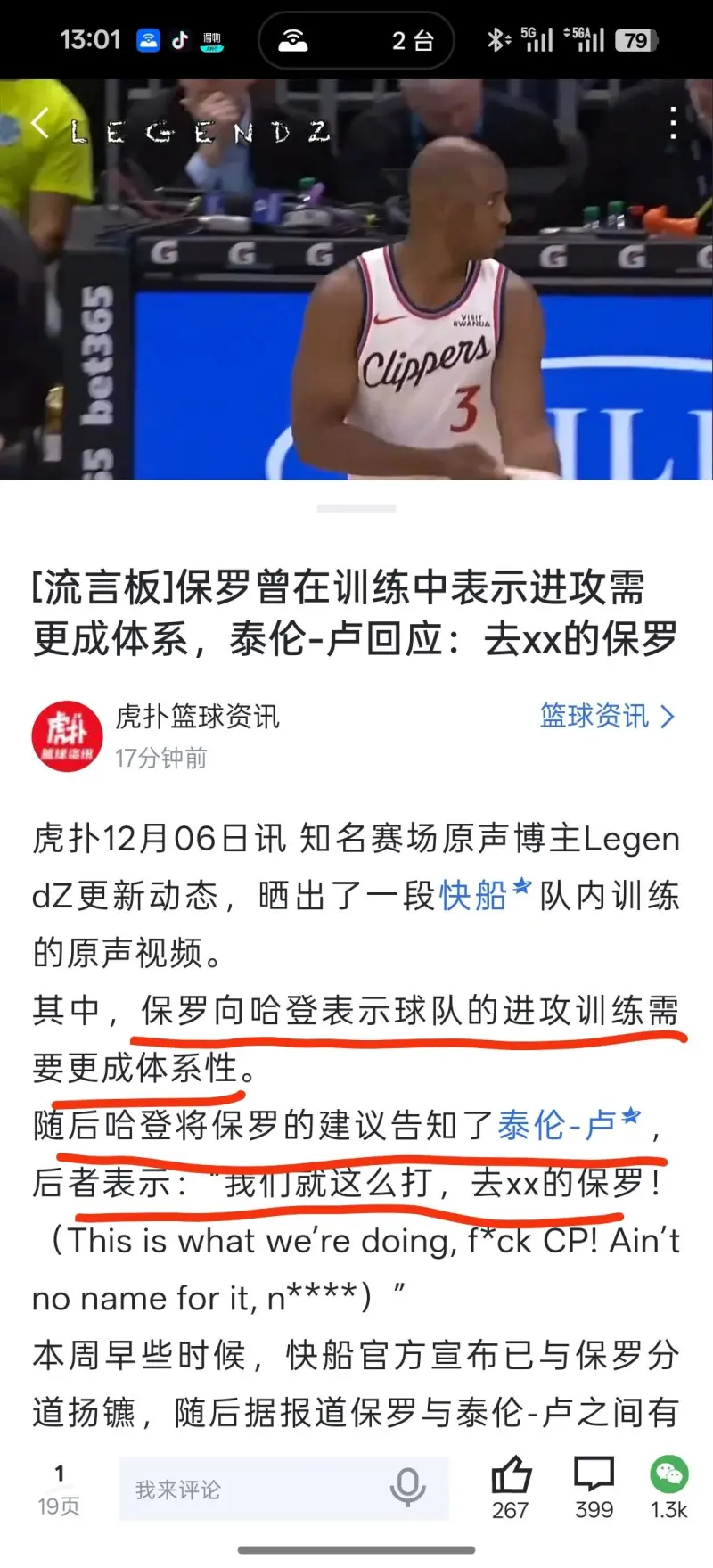 Haynes透露表示,在快船11月30号对阵独行侠的末节比赛中,保罗在暂停时与伦纳德进行了沟通,因为后者在防守克莱-汤普森时表现挣扎。(克莱末节得到17分)