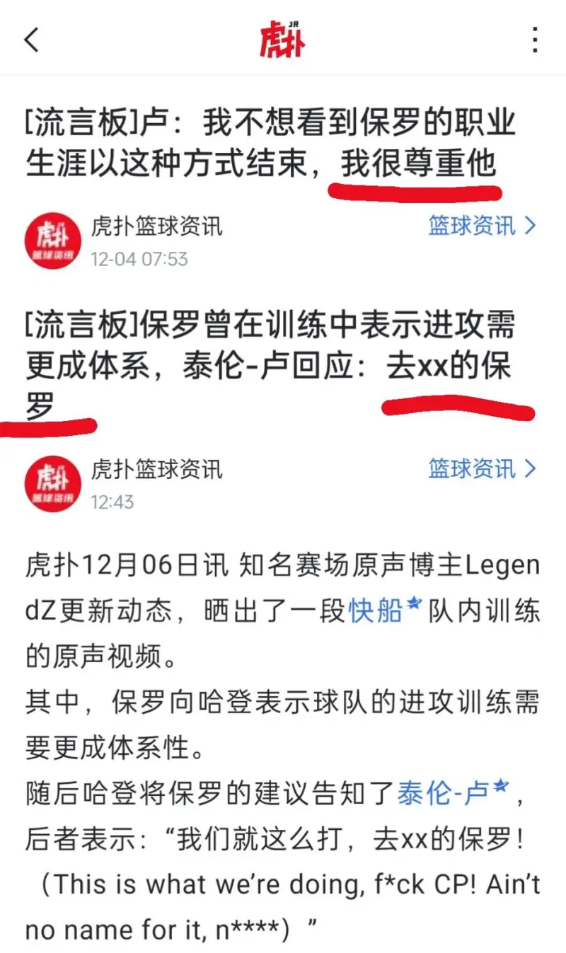 相关阅读:保罗曾在训练中表示进攻需更成体系,泰伦-卢回应:去xx的保罗