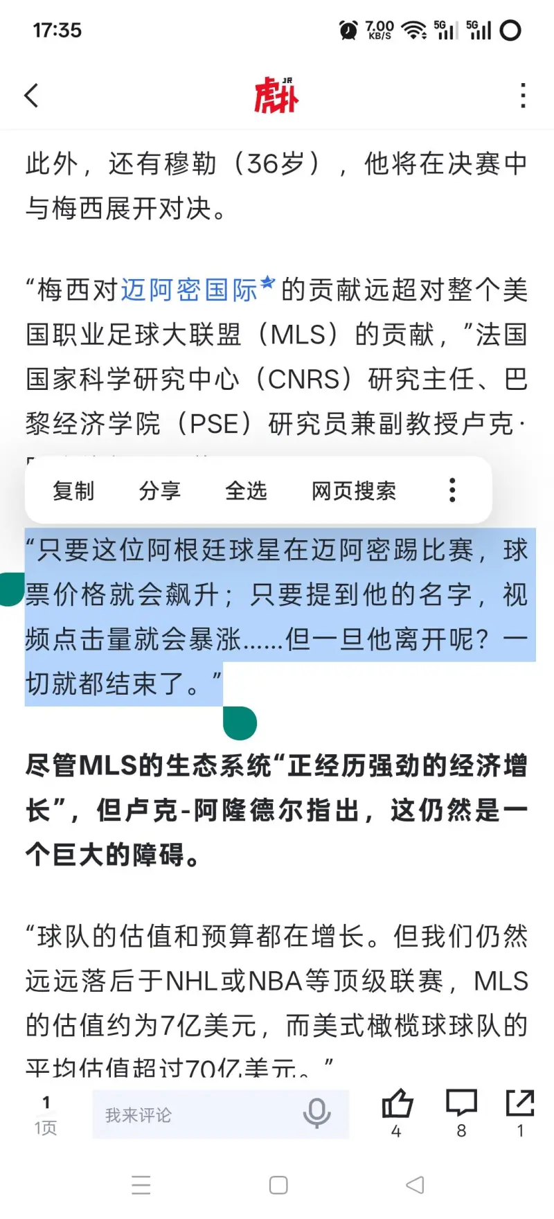 “只要这位阿根廷球星在迈阿密踢比赛,球票价格就会飙升;只要提到他的名字,视频点击量就会暴涨……但一旦他离开呢?一切就都结束了。”