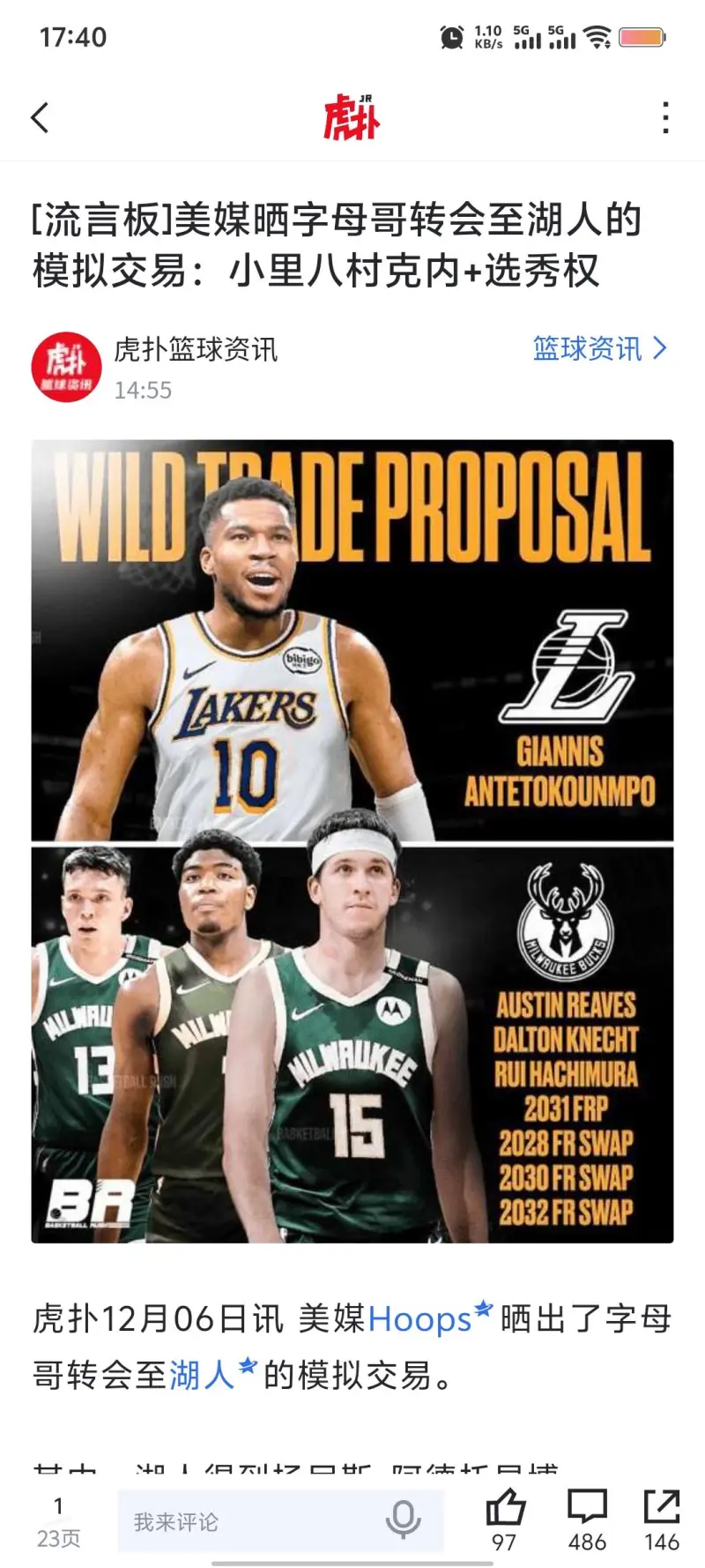 湖人出:詹姆斯+一个首轮加+若干首轮互换 入:字母哥