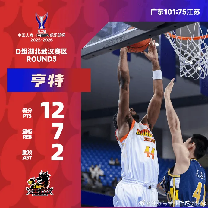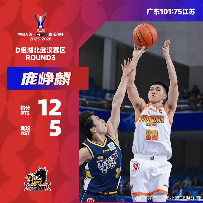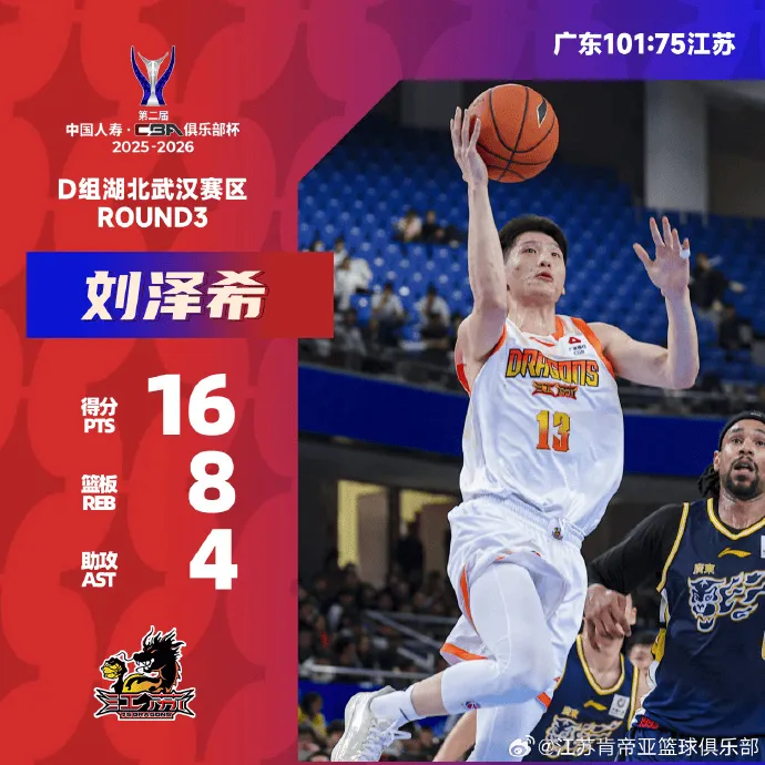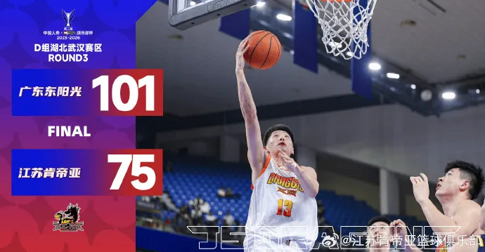 “本场比赛结束,最终江苏肯帝亚以75比101不敌广东东阳光。数据方面:刘泽希16分8篮板4助攻;亨特12分7篮板2助攻;庞峥麟12分5助攻。
