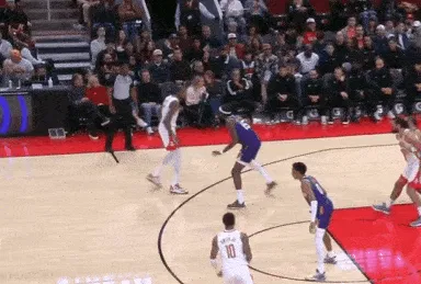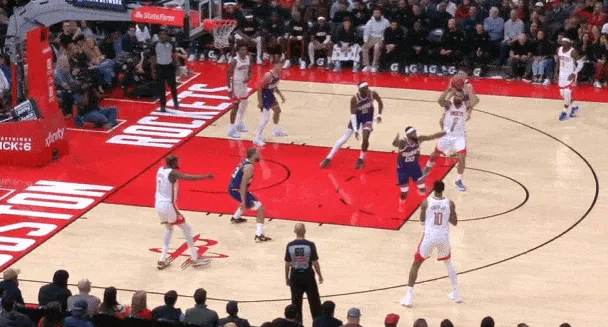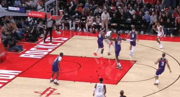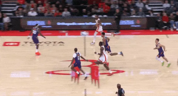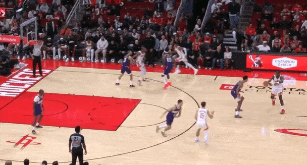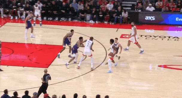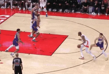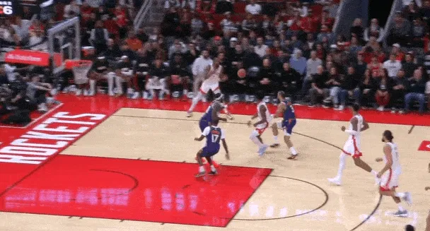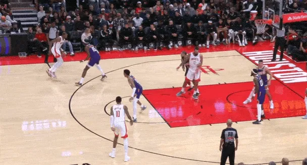 持球推动转换进攻,“跳步犹豫”启动左路突破直接过掉罗奥,随后借助卡佩拉在内线设置的“戈塔特掩护”长驱直入隔扣前来协防的狄龙。
