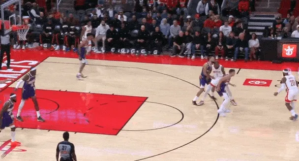 和亚当斯手递手换防制造马威换防,直接使用“Crossover”右路突破摆脱,面对邓恩的协防刷卡撩起手臂合球,跳步衔接侧身后仰金鸡独立顶着前来协防的狄龙打进,完成1打3。