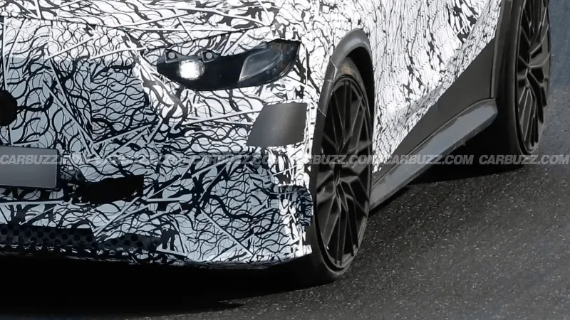 外观方面,GLC 53 采用了比普通版更为激进的空气动力学套件。车头部分,伪装贴纸下隐约可见更大的下分流器与扩大的进气口,前保险杠两侧也新增了气动装置。