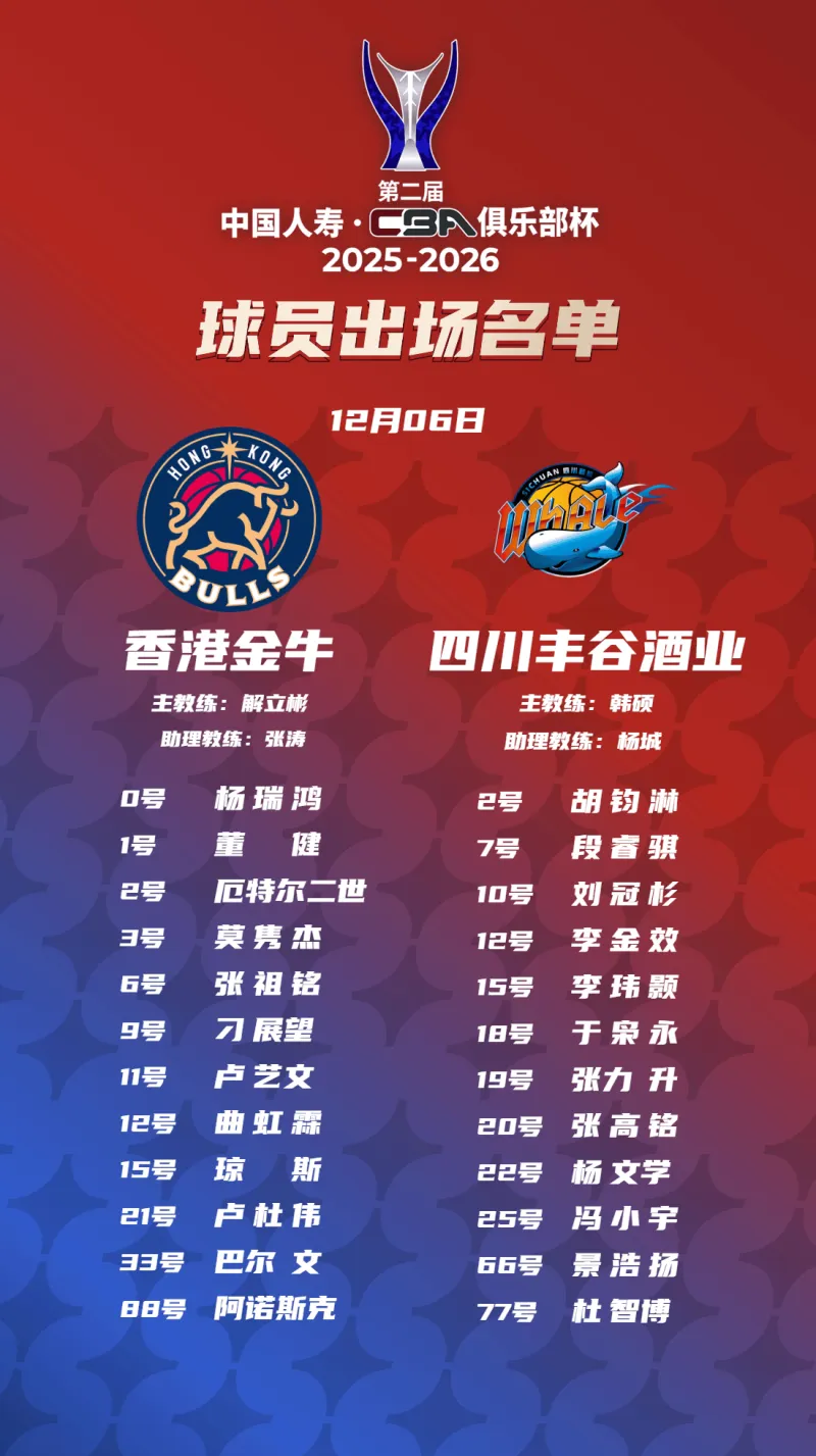 赛前,CBA官方公布双方大名单。