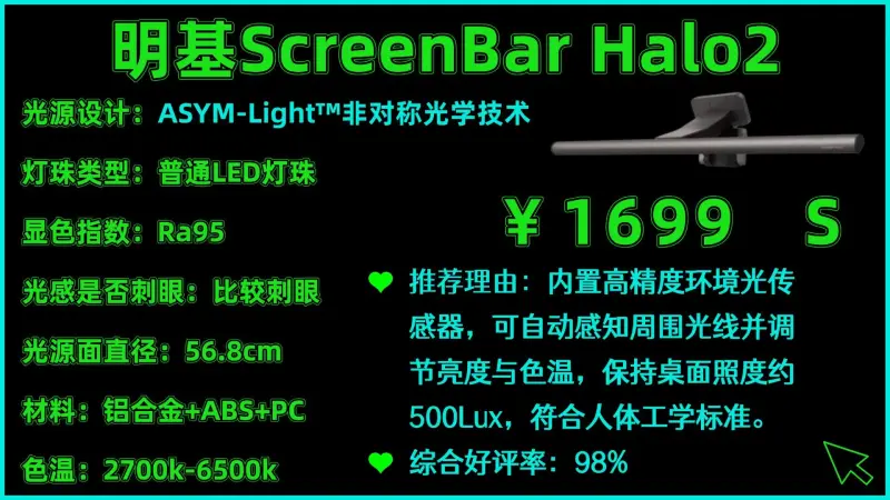 明基成立于2001年,隶属于明基友达集团,是全球知名的显示与数位影像品牌。依托强大的面板技术和多年显示研发经验,明基在显示器、投影机及专业色彩管理领域具有领先优势。明基ScreenBar Halo 2采用前灯+背光双系统设计,前灯亮度可达1000 lux,使桌面光线与环境光更均衡,有效减轻眼睛疲劳。非对称光路结合背光科学抑制直射与反射,避免眩光和屏幕反光。亮度与色温可在 2700 K–6500 K范围内自由调节,适应夜间办公、看电影或游戏等多种场景。