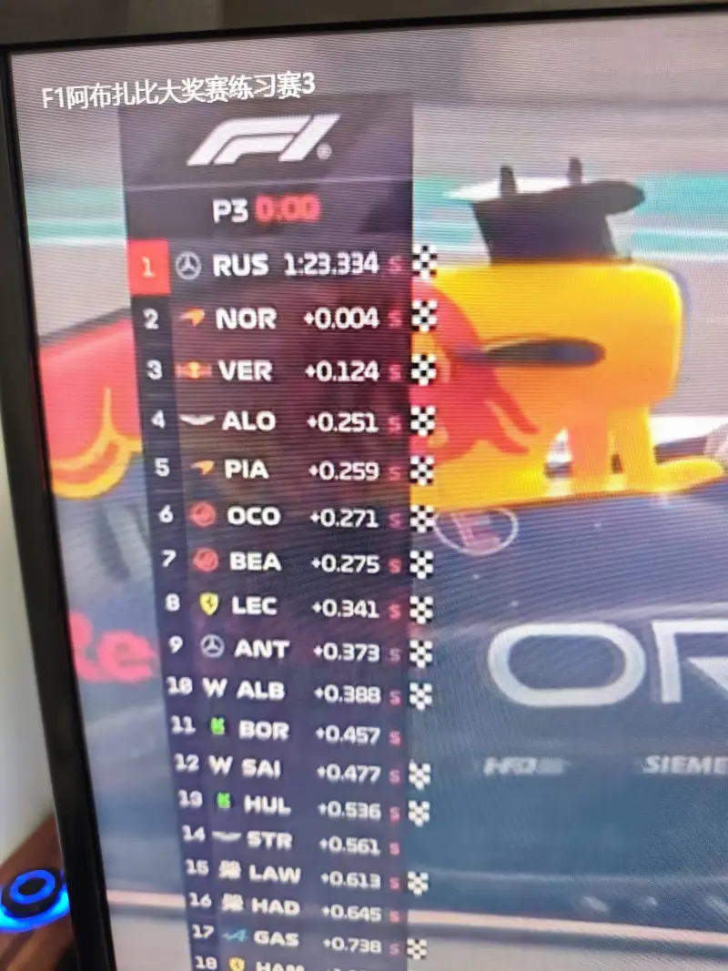 2024年F1阿布扎比站排位赛最快圈速为1:22.595,按照习惯今年车肯定比去年快,参考卡塔尔2024年F1卡塔尔站排位赛最快圈速为维斯塔潘(红牛)的1:20.520,2025年皮亚的1:19.387,提高超过1.2秒,今年的杆位差不多1:21.300左右
