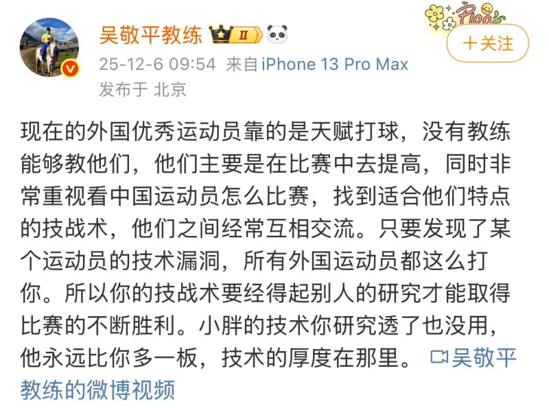 现在的外国优秀运动员靠的是天赋打球,没有教练能够教他们,他们主要是在比赛中去提高,同时非常重视看中国运动员怎么比赛,找到适合他们特点的技战术,他们之间经常互相交流。只要发现了某个运动员的技术漏洞,所有外国运动员都这么打你。所以你的技战术要经得起别人的研究才能取得比赛的不断胜利。小胖的技术你研究透了也没用,他永远比你多一板,技术的厚度在那里。