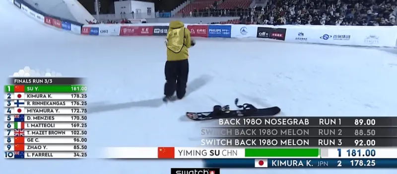苏翊鸣在三跳中都选择了1980动作,在第一跳中获得89.00分,第二跳88.50分,在最后一跳中顶住压力,挑战反脚的1980并最终得92.00的高分,力克第二名的预赛第一日本选手木村葵来。