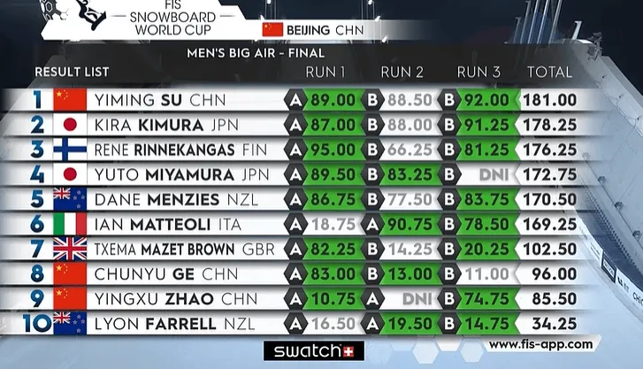 虎扑12月06日讯 FIS国际雪联单板滑雪大跳台世界杯北京站决赛比赛刚刚结束,冬奥冠军苏翊鸣以总分181夺大跳台第二金。