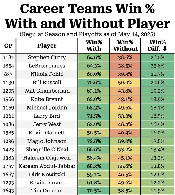 上赛季小样本7胜1负 大样本出战和缺席胜率历史第二