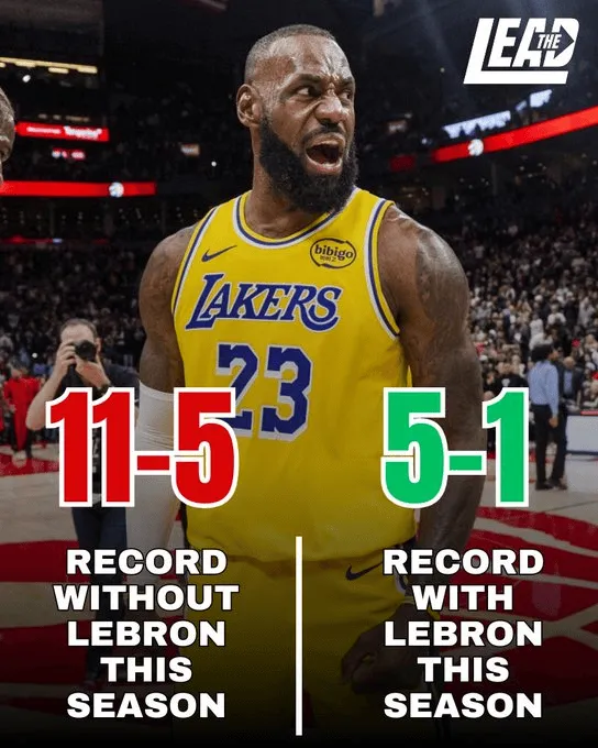 美媒The Lead晒出海报:“詹姆斯缺阵时湖人11胜5负,出战时高达5胜1负。”