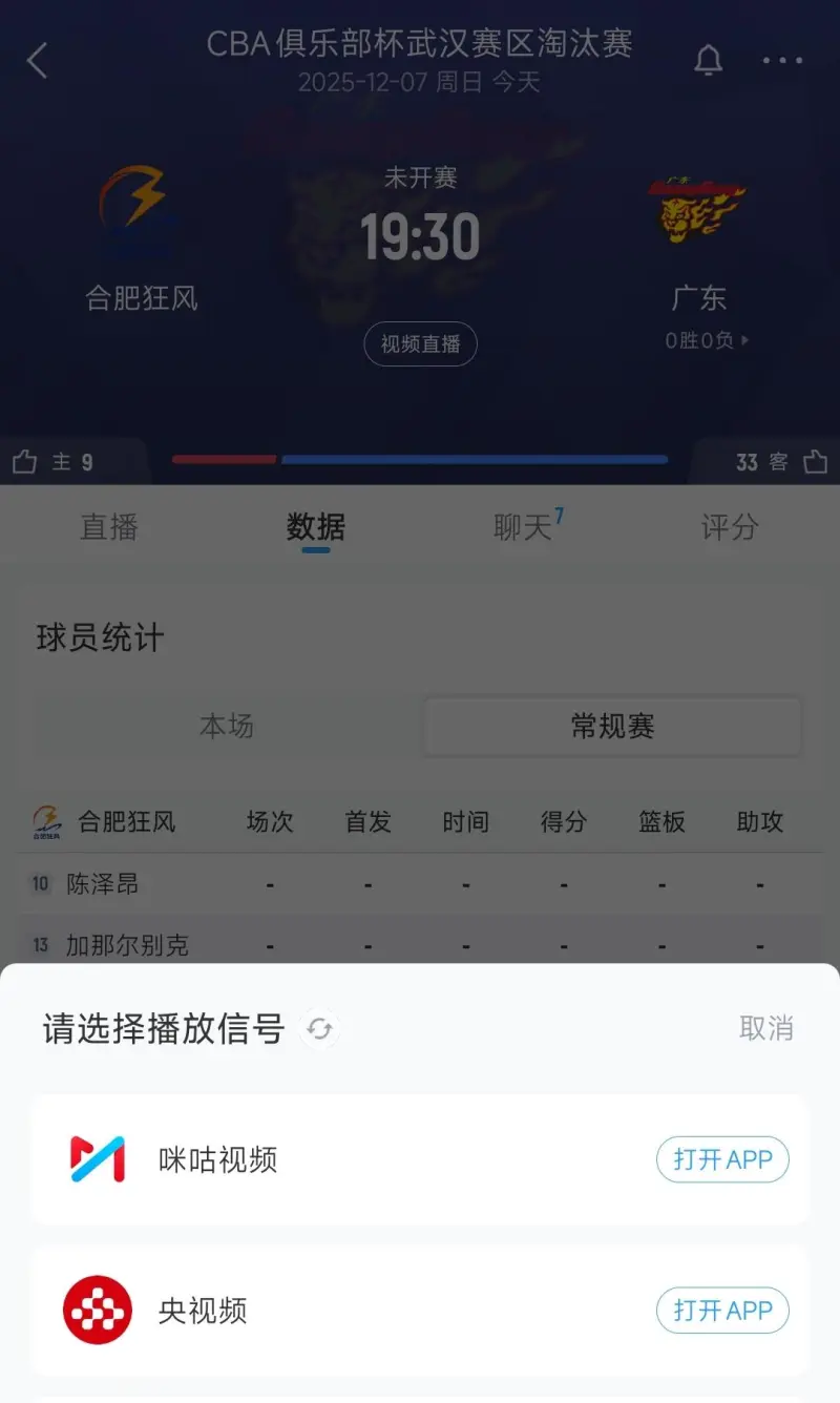 12月7号 晚19:30 广东东阳光 VS 合肥狂风队