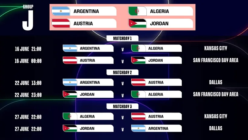 虎扑12月07日讯 2026美加墨世界杯赛程全部公布,J组赛程如下(北京时间):