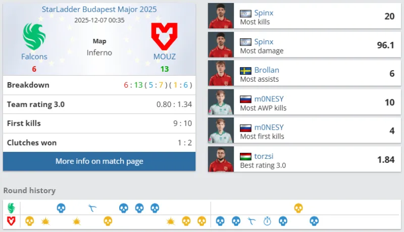 虎扑12月07日讯 布达佩斯Major第三阶段瑞士轮2-1组,MOUZ对阵Falcons图二Inferno比赛结束,Falcons 6-13 MOUZ。MOUZ火力全开扳回一城。双方进入决胜图Nuke。