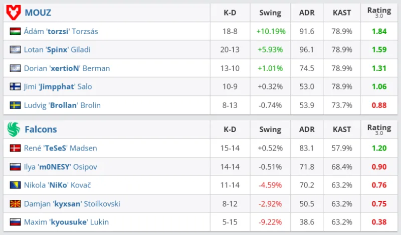 下半场易边再战。手枪局失利后,Falcons选择ECO再送一分。第十五局,MOUZ三雷战术成功香蕉道先拿monesy首杀,Falcons转攻A区失败,MOUZ拿下长枪局。第十七局,torzsi大狙中路先拿首杀,Falcons人数劣势各点被突破送出七个赛点!最终,图二MOUZ 13-6 Falcons,轻取自选图。MOUZ扳回一城,双方进入决胜图Nuke。