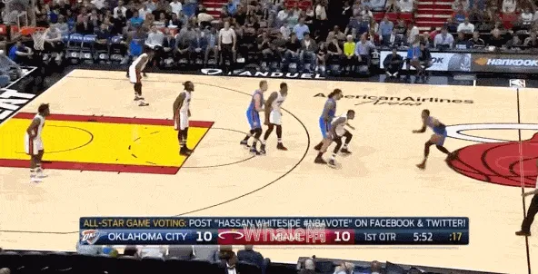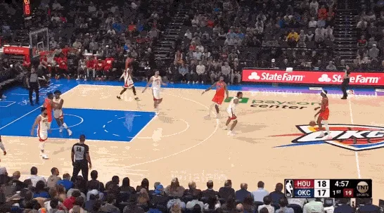上图,威少与队友西班牙挡拆后,突破篮下。亚当斯借助无球掩护人的被掩护跟进到油漆区后,接球暴扣得分。