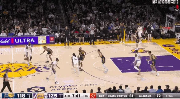 比如上图,詹姆斯策动湖人三锋线之间的西班牙挡拆,助攻普林斯接球后哦攻框得手。